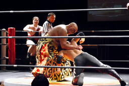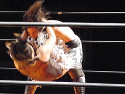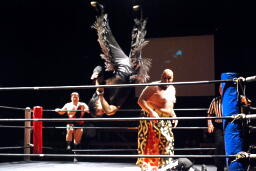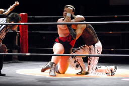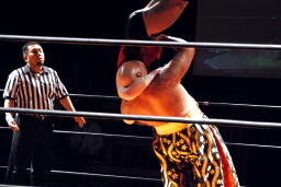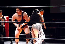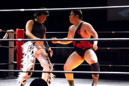 アントンロープに飛ぶ、MIKAMIヒップトス、アントンブロックして逆にヒップトス、MIKAMI切り返してウラカンホイップ(左写真)。アントン足をすくってカバー、MIKAMIキックアウト。両軍タッチ。