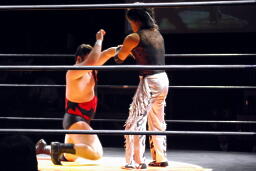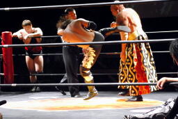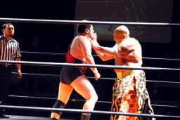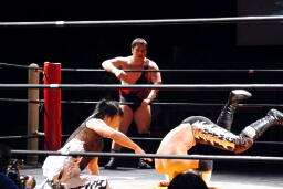 MIKAMIロープに飛ぶ、エプロンから佐々木がキック、アントンはダブルチョップ(右写真)。佐々木にタッチ。