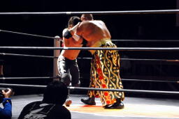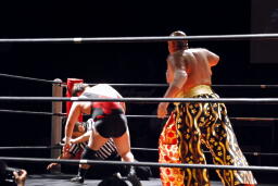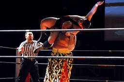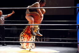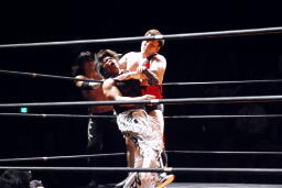 MIKAMIロープに振る、佐々木ブロック。MIKAMIナックル入れて再度ロープに振る、佐々木切り返してバックドロップ(右写真)、アントンにタッチ。アントンMIKAMIにラリアット、
