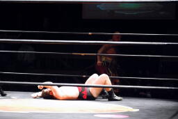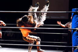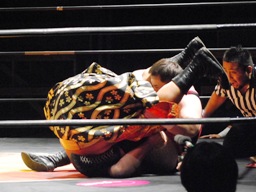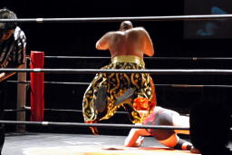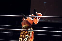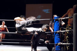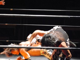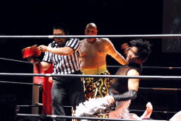 MIKAMIはロープにもたれていた佐々木にミッキーブーメラン(右写真)、カバー、カウントは1。MIKAMIタイガードライバー(初代式)からセントーン、カウント2。星誕期にタッチ。