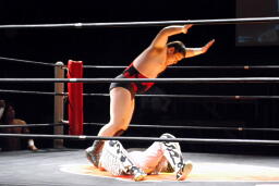 星誕期MIKAMIにタッチしてもう一発ボディスラムでセット、そこにMIKAMIがトペ・アトミコ(左写真)。MIKAMIコーナーパンチ連打からブロンコバスター、ヒザで圧迫。5分経過。