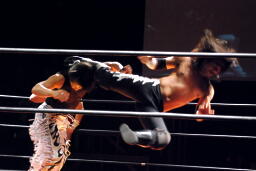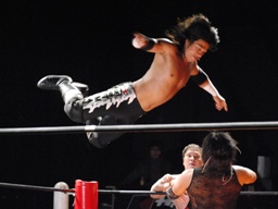 MIKAMIロープに飛ぶ、佐々木ジャンピングハイキック(右写真)。両軍タッチ。