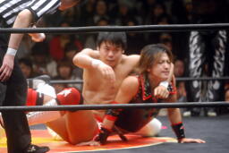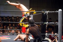 KUDOはダイビングダブルニーアタック(左写真)、カウント3。