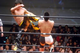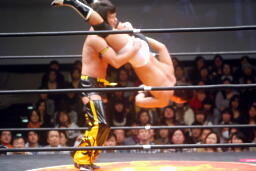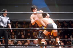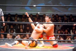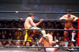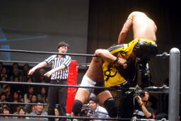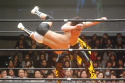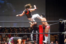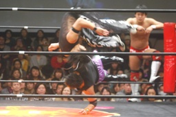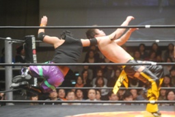 KUDOロープに振る、平田パンチをかわしてコルバタ(右写真)、安部にタッチ。