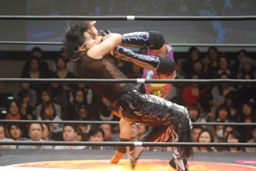 安部ロープに飛んでウィッチブレイド(右写真)、ロープに飛んでドロップキック。5分経過。