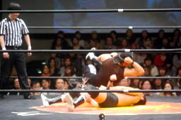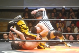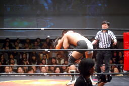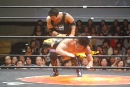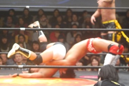 ダブルでロープに振ってMIKAMIがカニばさみ、KUDOがパントキック。仰向けになったところにMIKAMIセントーン(右写真)、平田が上体を起こすとKUDOがドロップキック、KUDOカバー、カウント2。
