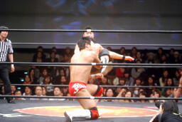 吉野トラースキック(左写真)、カウント2。