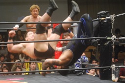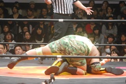 そしてムーンサルトプレス(右写真)、入江と矢郷がカット。