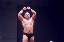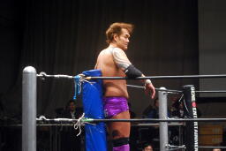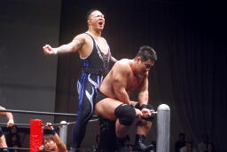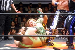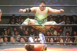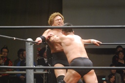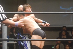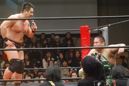コーナーに上ると「チェストー!」ミサイルキック(左写真)、カウント2。