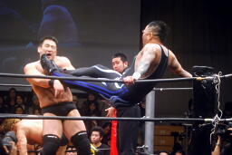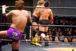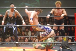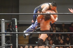 HARASHIMAファルコンアロー、入江ブロックして肩に担ぐと垂直落下式バックフリップ(左写真)、カウント2。