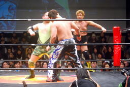HARASHIMA入って折原と2人でコーナーに振る、高木切り返しHARASHIMAと折原をまとめてコーナークローズライン(左写真)。