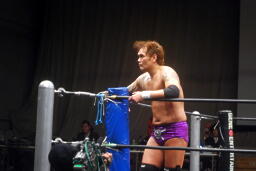 コーナーに振って突っ込む、HARASHIMAはエプロンに出てハイキック(右写真)。