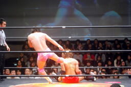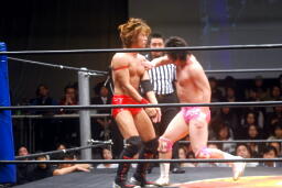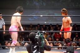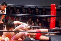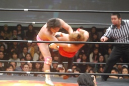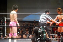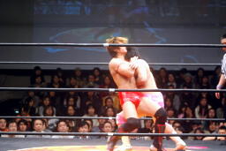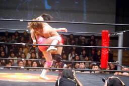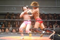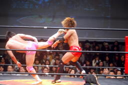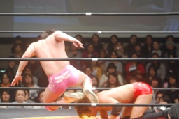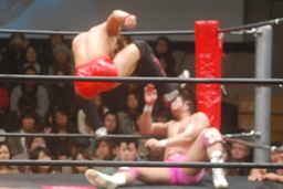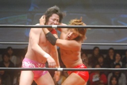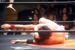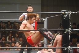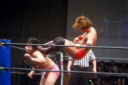 高尾コーナーに振って串刺しエルボー、串刺しドロップキック(左写真)、カウント2。10分経過。