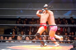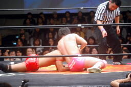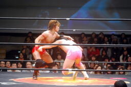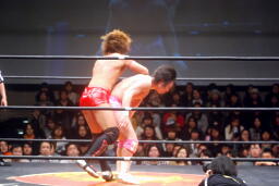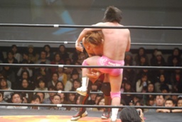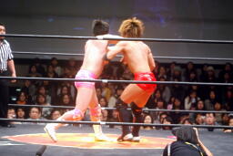 首投げからネッククラッチ(右写真)、スリーパーに移行、石井ロープ。高尾ボディスラム2発からカバー、カウント2。