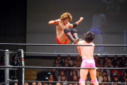 石井エルボー、コーナーに振って串刺しエルボー、高尾かわして石井の後頭部にドロップキック(左写真)。