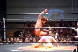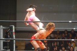 高尾ボディスラム、コーナーに上る、石井下からドロップキック(左写真)。