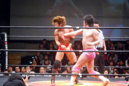 しかしニールキックはかわされ高尾が首固め(左写真)、カウント2。