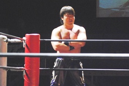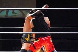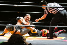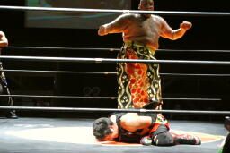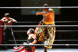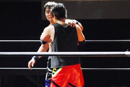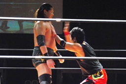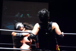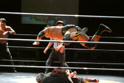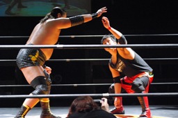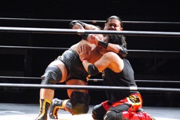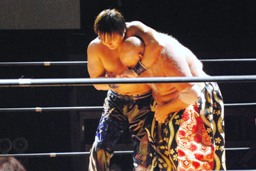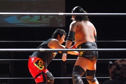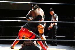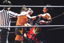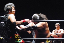 星誕期ロープに振ってショルダーブロックの打ち合い(右写真)。HARASHIMAが星誕期にロープに飛ぶよう指示、星誕期ロープに飛んでショルダーブロック、HARASHIMA吹っ飛ぶ。