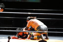安部がリングに戻る、星誕期ボディスラムからキック(右写真)。