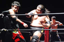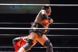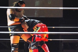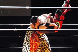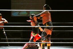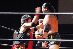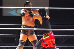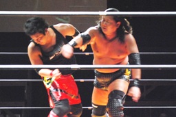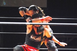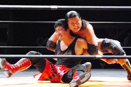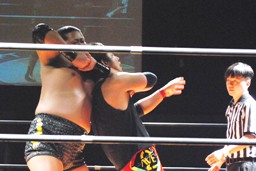 ロックアップ、大鷲ヘッドロック、安部がロープに振ろうとするが大鷲は振らせない(左写真)。