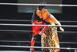 星誕期ベアハッグ(左写真)、コーナーに投げつける。