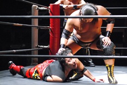 大鷲捕まえる、安部チョップ(右写真)、大鷲ニーリフト、安部ダウン。