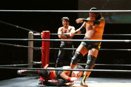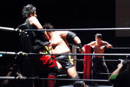 大鷲ニーリフト(右写真)、安部をコーナーに投げつける。安部はHARASHIMAにタッチ。大鷲も星誕期にタッチ。