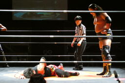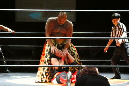 大鷲WARスペシャルに移行、安部泣き顔(左写真)、なんとかロープ。大鷲ボディプレス、カウント2。