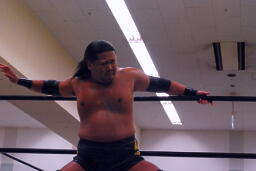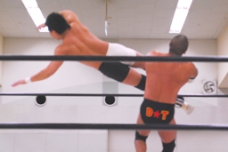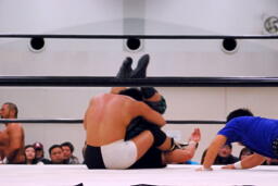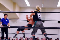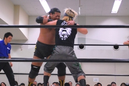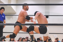 大鷲ボディスラム狙う、東郷ブロックして逆に投げようとする。大鷲パンチ入れてボディスラム、東郷は着地してボディスラム(左写真)。両軍タッチ。