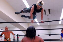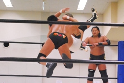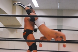 トップロープに引っ掛けてドロップキック(左写真)、カウント2。