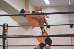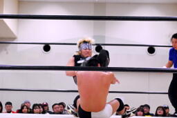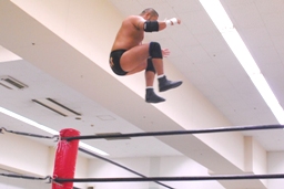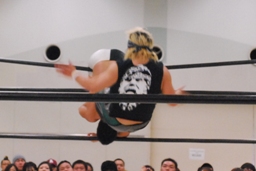 東郷ぺディグリー、平田が持ちこたえられずに崩れ東郷頭にストンピング。東郷コーナーに上ってダイビングセントーン(左写真)、カウント3。
