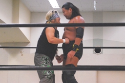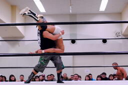 ウラノがチョップ、GRANMAはダブルのブレーンバスター狙う、大鷲切り返す(左写真)。