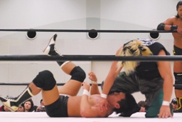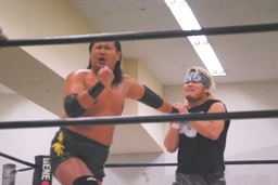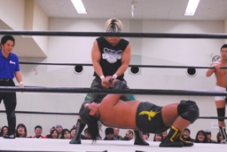 大鷲ボディプレス、平田ドロップキック(左写真)、カバーは東郷がカット。
