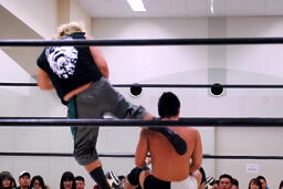 先発は東郷と平田。ロックアップ、東郷ヘッドロック、平田ロープに振る、東郷ショルダーブロック。東郷ロープに飛ぶ、平田リープフロッグでかわしてドロップキック(右写真)、ストンピング。