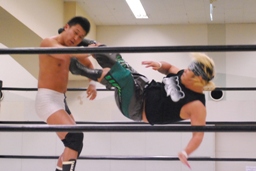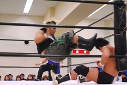 首投げからもう一発ドロップキック(左写真)、カバーは大鷲がカット。東郷が大鷲を場外に。