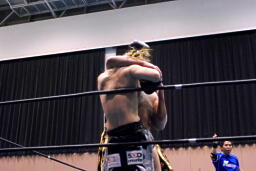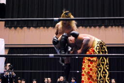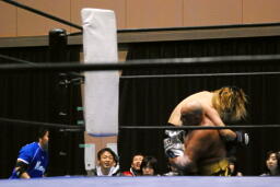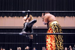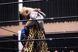 しかし鳥羽は攻撃に移れず。星誕期ボディスラム、カウント2。コーナースプラッシュ(右写真)。
