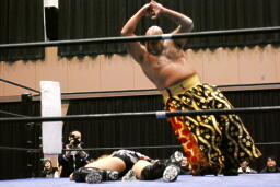 リングに戻すとストンピング、エルボードロップ(左写真)。さらにストンピングからカバー、カウント2。