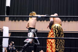 鳥羽ローキック(左写真)。星誕期ロープに押し込むがブレーク。