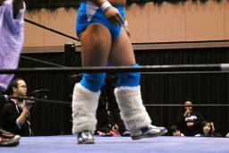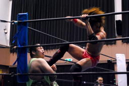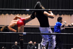 MIKAMI串刺しビッグブーツをキャッチ、スク〜ルボ〜イ、カウント2。MIKAMIバック取る、高尾ロープに逃げる。高尾急所蹴りからトラースキック(右写真)、松永にタッチ。MIKAMIも入江にタッチ。