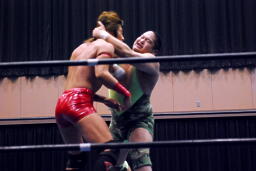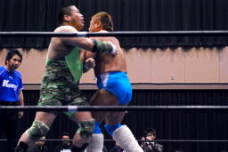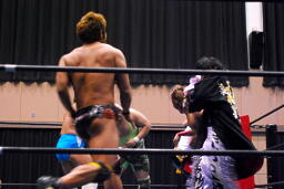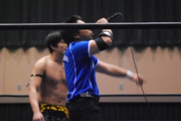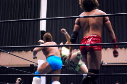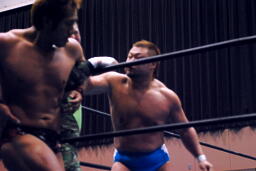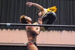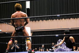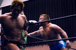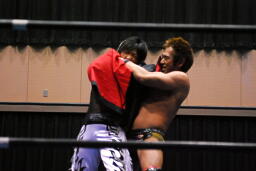 入江と松永が入る。松永ヘッドロック、入江がロープに振ってショルダーブロックの打ち合い(左写真)。入江がロープに飛ぶと高尾がエプロンからキック、そこに松永がショルダーブロック。高尾にタッチ。