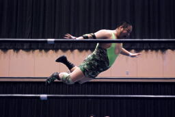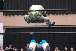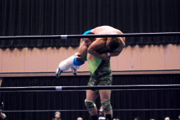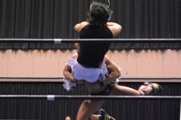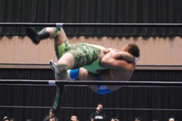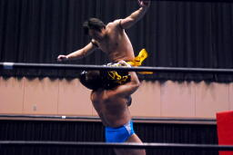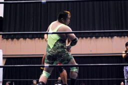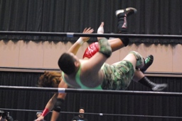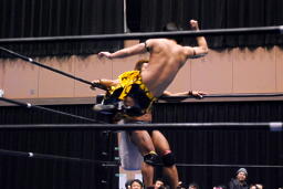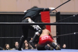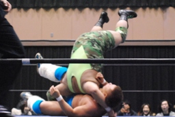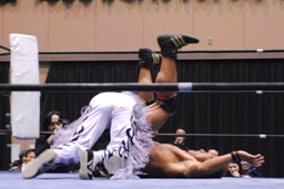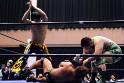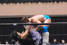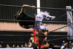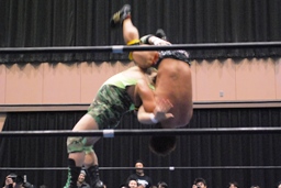 MIKAMIセントーン、カウント2。MIKAMIブレーンバスターの体勢、マイケル逆に投げる、MIKAMI着地してロープに飛ぶ、マイケルMIKAMIをキャッチしてスパインバスター(右写真)、高尾にタッチ。