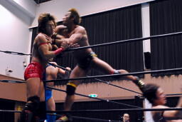 MIKAMI組が入って来るとシットハート♥ファウンデーションが先制攻撃(右写真)、KUDOと入江を場外に。