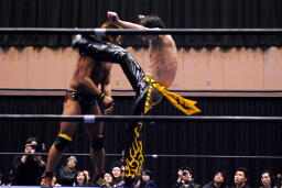 KUDOマイケルにスワンダイブミサイルキック(右写真)、カウント2。