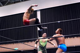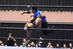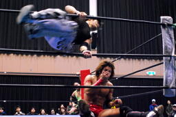 マイケルロープに飛ぶ、入江パワースラム(左写真)、KUDOにタッチ。
