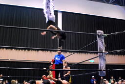 入江マイケルを肩に担いでバックフリップ狙う、高尾がキックでカット(右写真)。