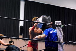 しかし高尾が一斗缶でカバーをカット、さらにMIKAMI、KUDO、トミー茨城レフェリーにも一斗缶攻撃、反則負けを選択(左写真)。