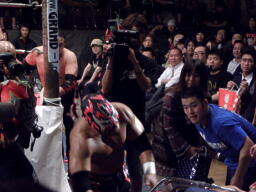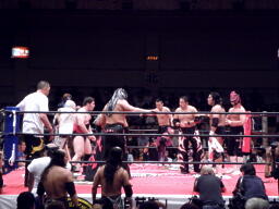 メインに出場する10人が一人ずつ入場、リングに揃う(右写真)。やっぱまだ「Metal on Metal」が流れても「サスケだ!」とはすぐには思わないなあ。各試合は15分一本勝負。