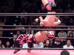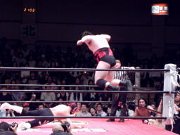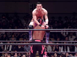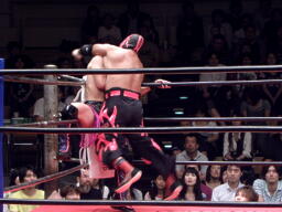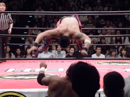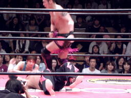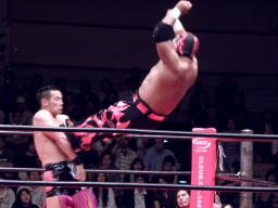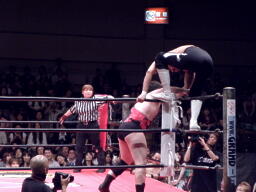 岸和田コーナーに上ってダイビングボディプレス(右写真)、カウント2。