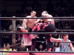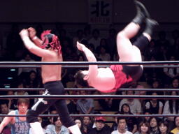 HIROKIロープに飛ぶ、岸和田カウンターのラリアット(右写真)、カウント2。
