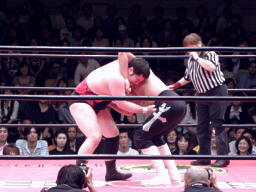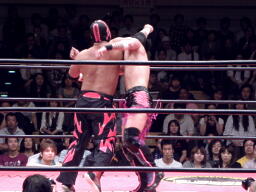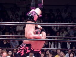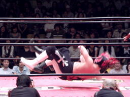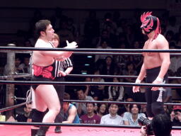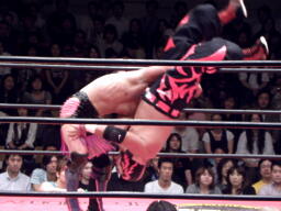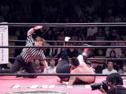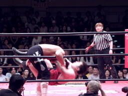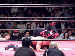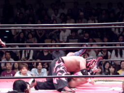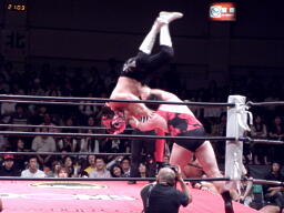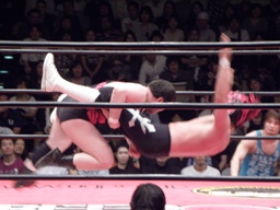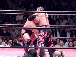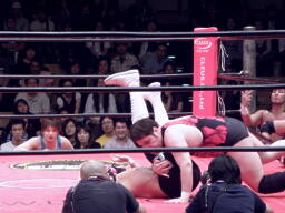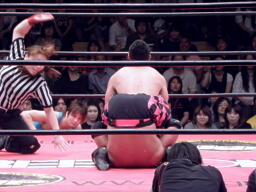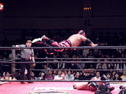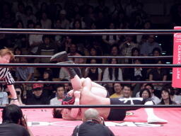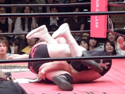 ウィンガーコーナーに振って突っ込む、アントンかわしてスクールボーイ(右写真)、ロープに足を掛けで押さえ込むがカウントは2。